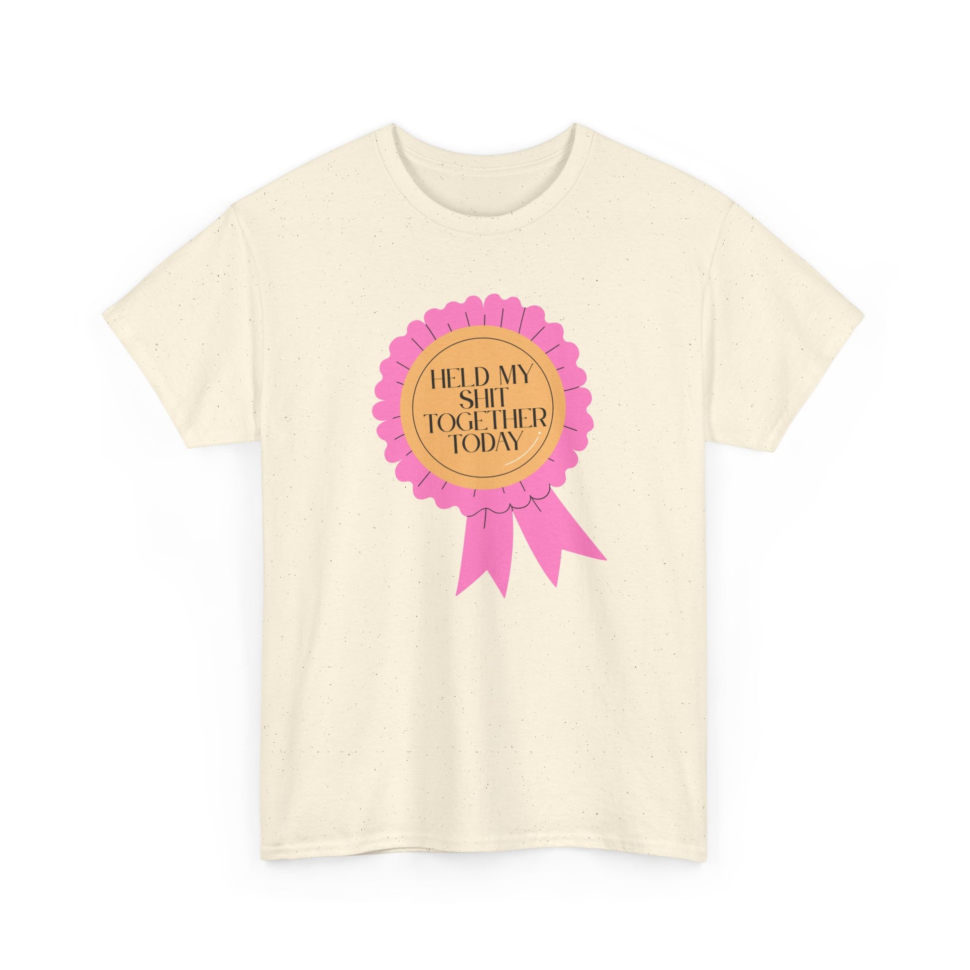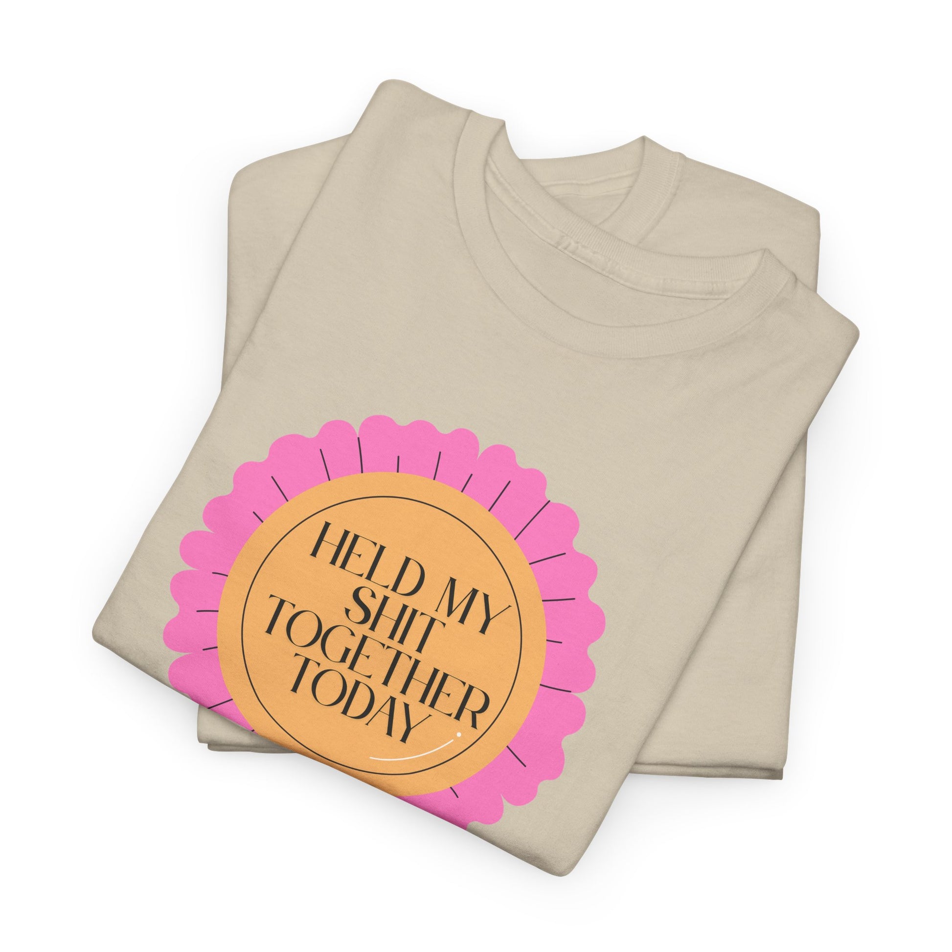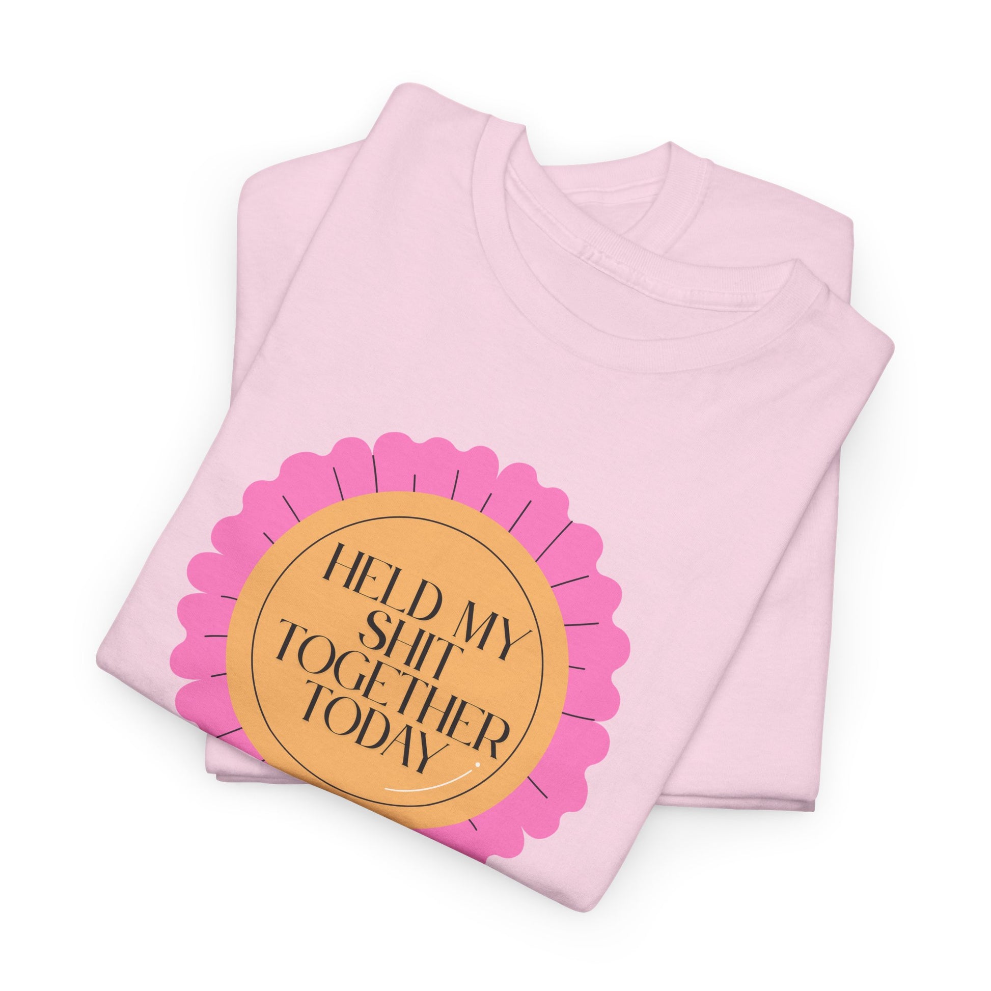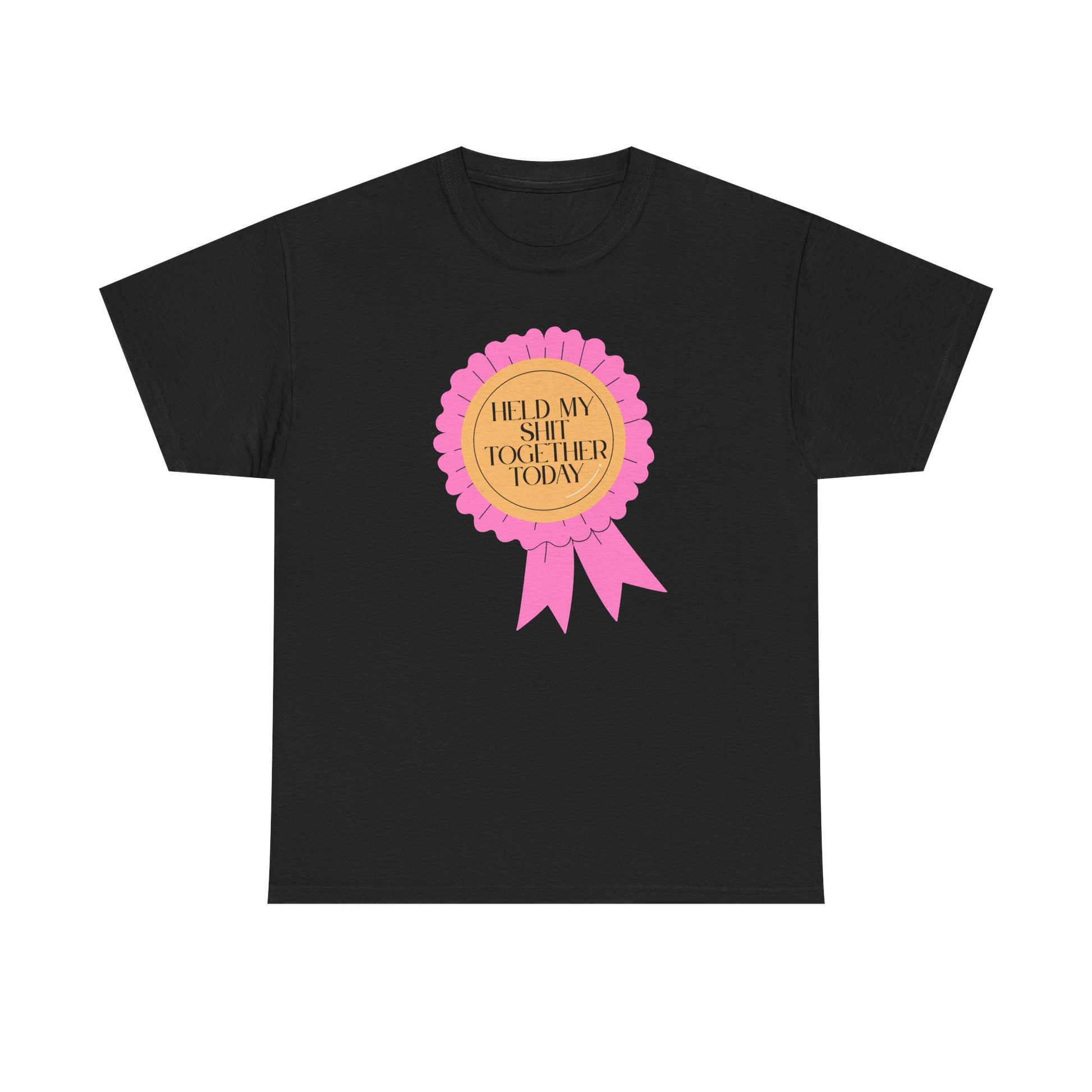 A soft, classic tee that speaks with a wink. The front features a playful pink rosette graphic with gold-accented type reading “Held My Shit Together Today,” turning small daily victories into wearable celebration. Lightweight but durable, the shirt keeps its shape through errands, long commutes, and cozy evenings. It sits relaxed at the shoulders and drapes comfortably — the kind of staple you reach for when you want to be honest, funny, and a little proud. Wear it to brunch with friends, layered under a jacket for a casual meeting, or lounging at home after a long day. The tone is warm, self-aware, and quietly triumphant.
