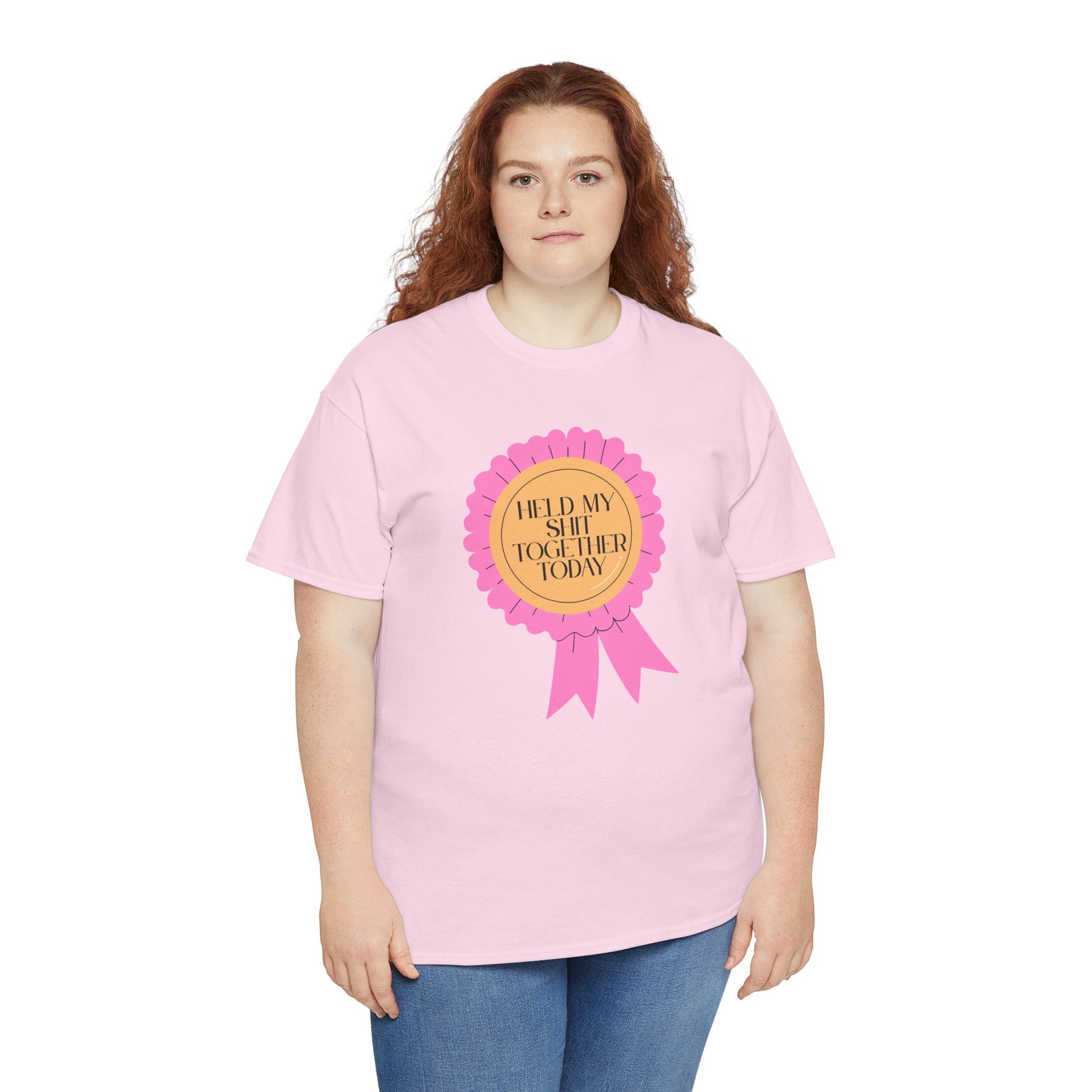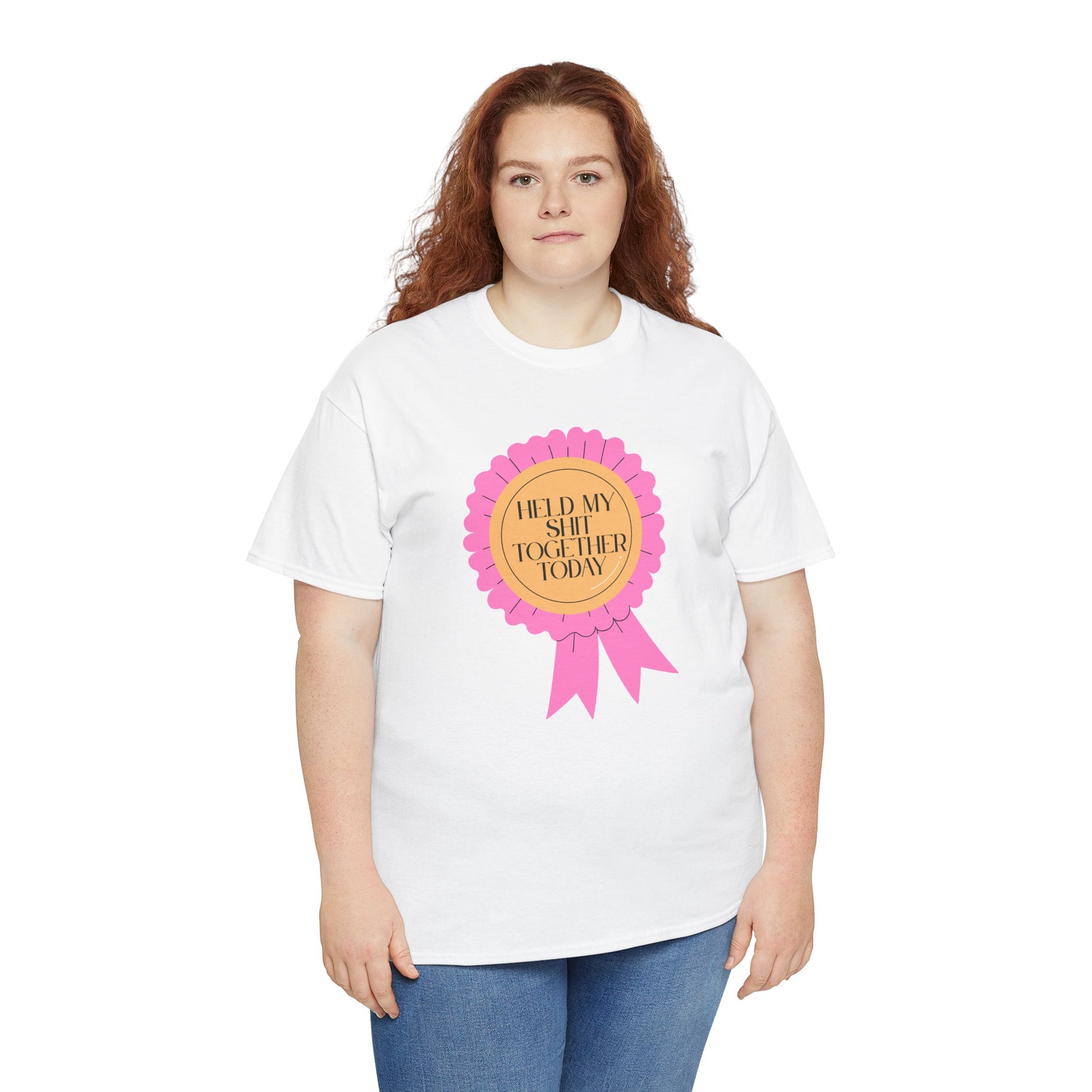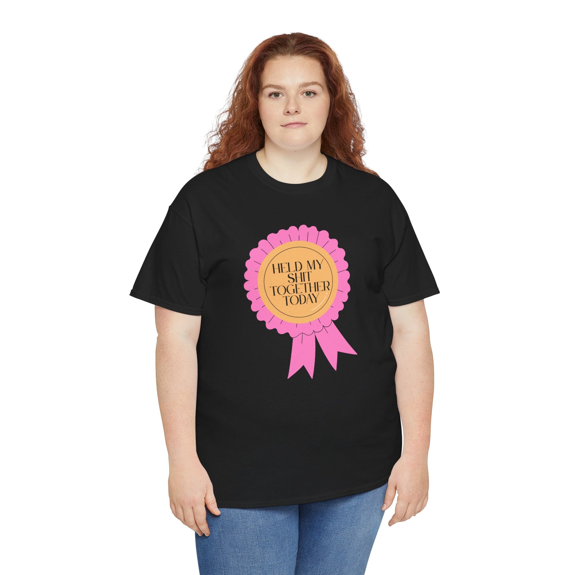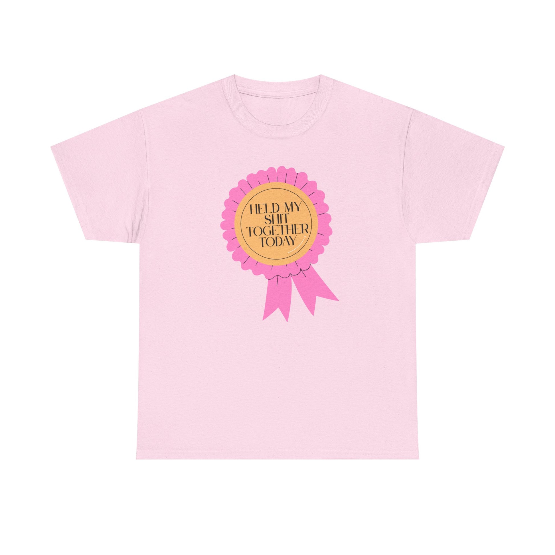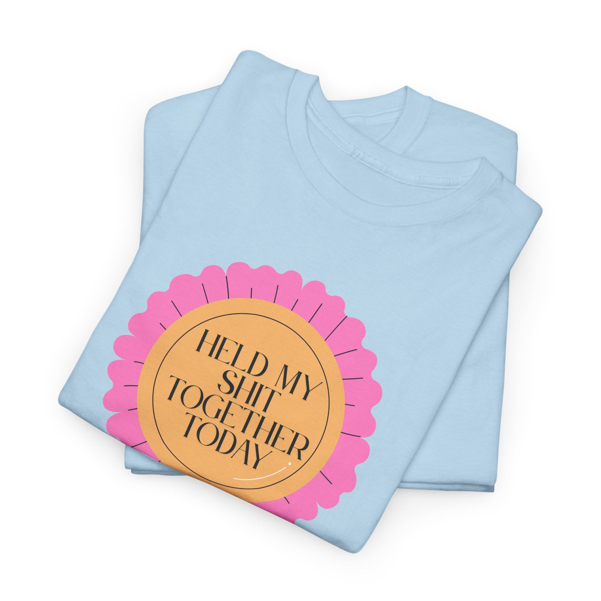 A soft, classic tee that speaks with a wink. The front features a playful pink rosette graphic with gold-accented type reading “Held My Shit Together Today,” turning small daily victories into wearable celebration. Lightweight but durable, the shirt keeps its shape through errands, long commutes, and cozy evenings. It sits relaxed at the shoulders and drapes comfortably — the kind of staple you reach for when you want to be honest, funny, and a little proud. Wear it to brunch with friends, layered under a jacket for a casual meeting, or lounging at home after a long day. The tone is warm, self-aware, and quietly triumphant.
