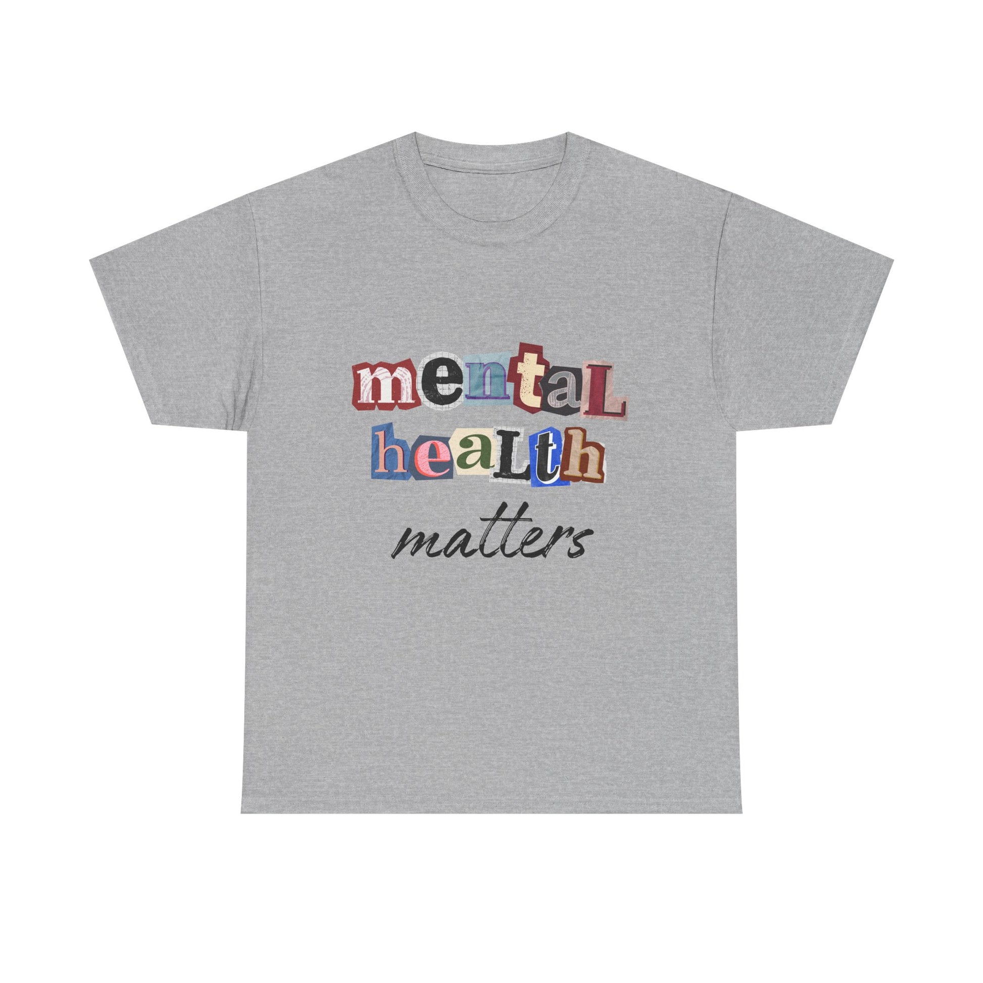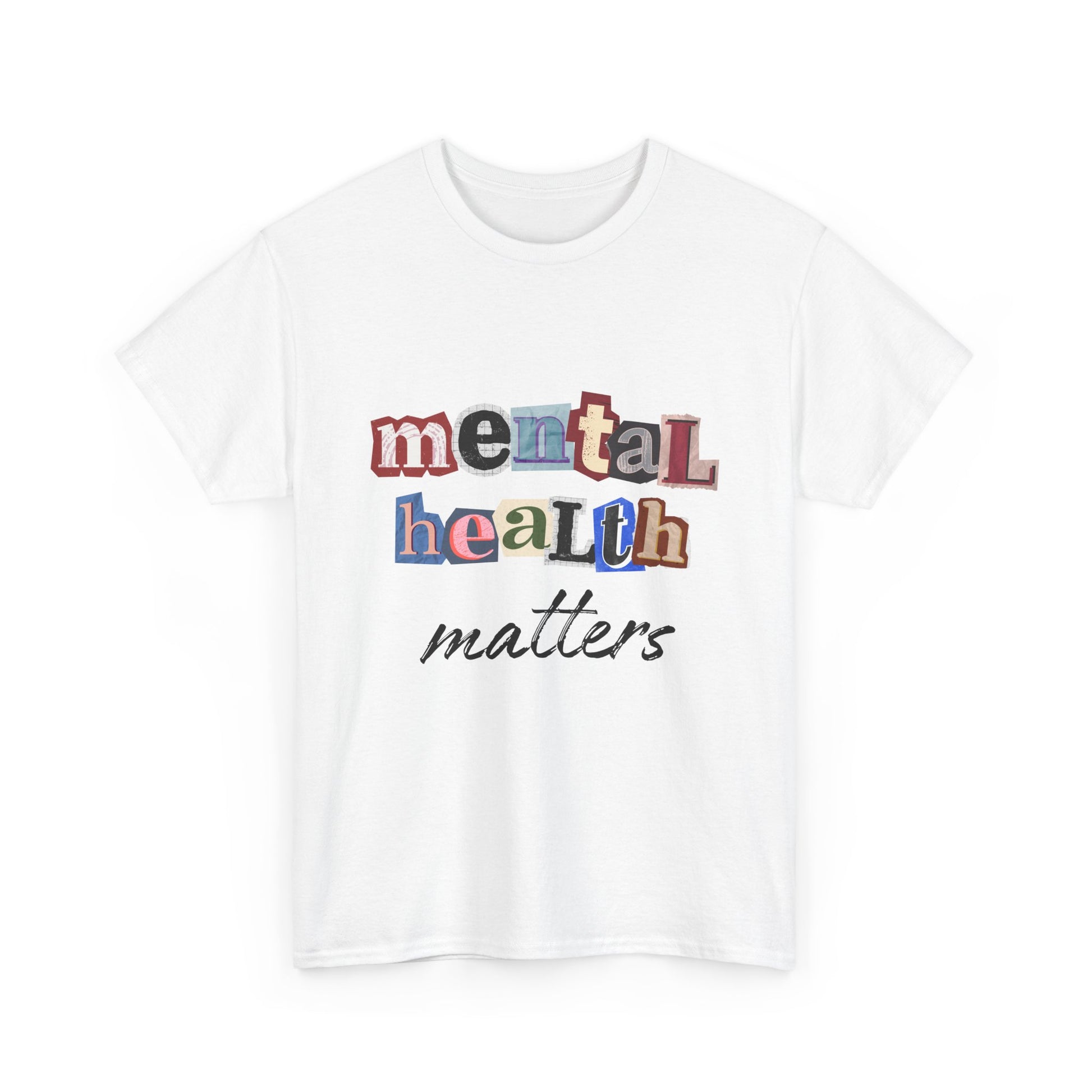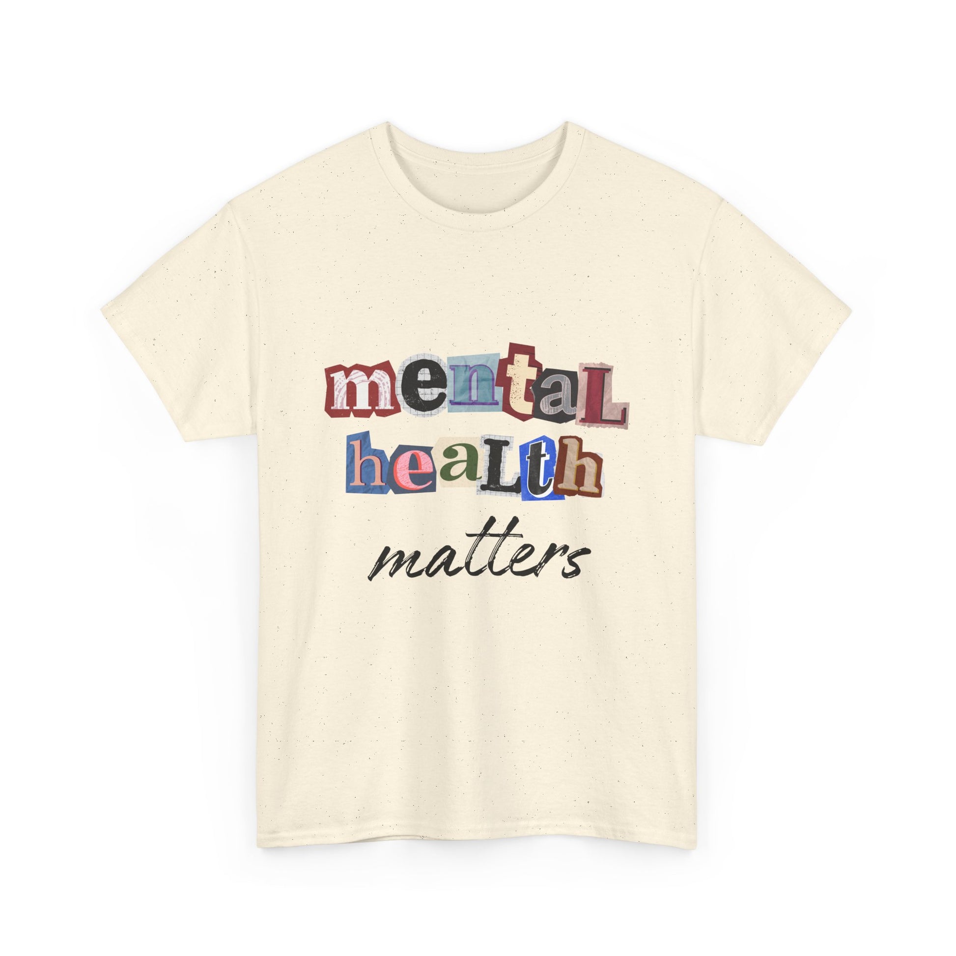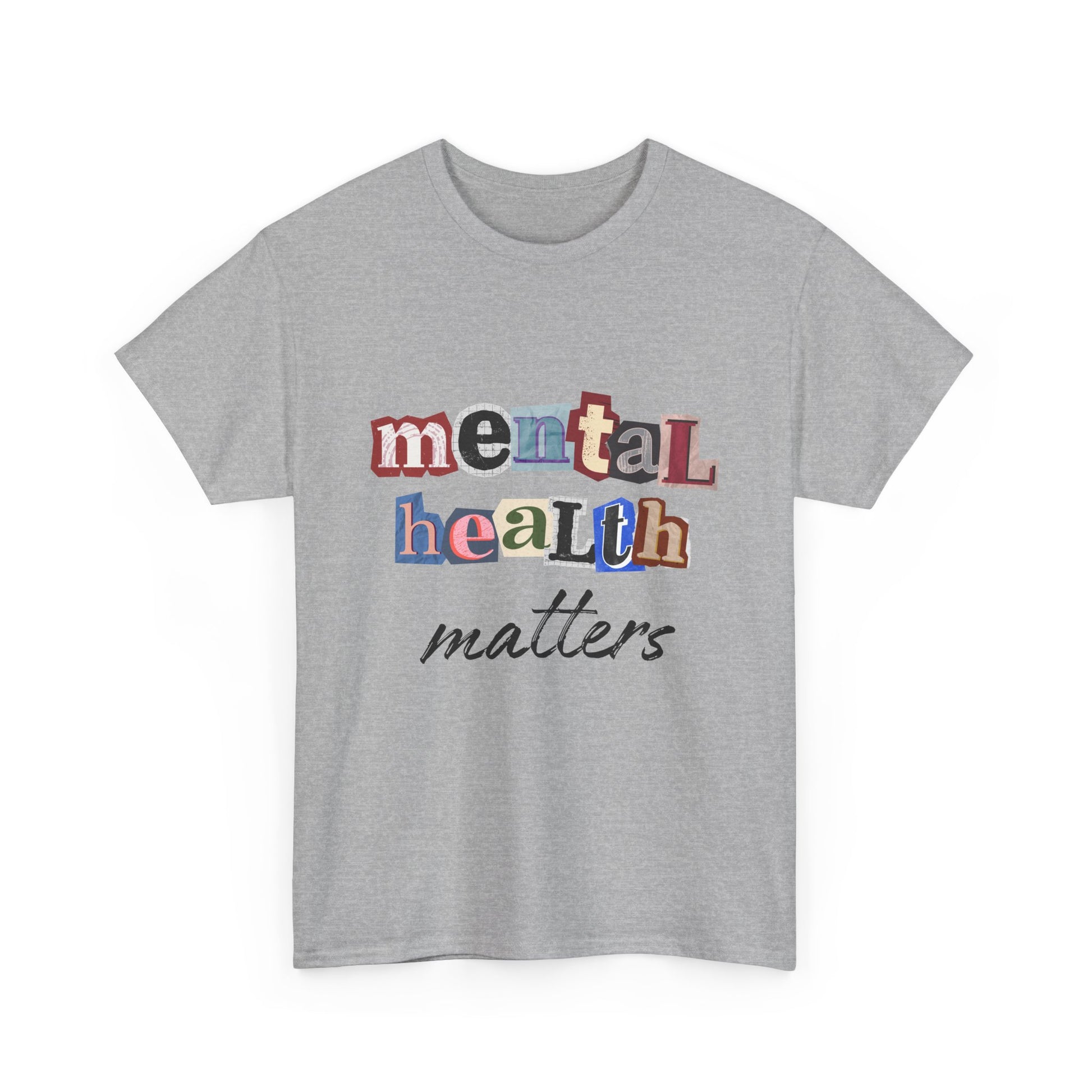 This soft, classic tee carries a quiet, sincere message: mental health matters. The design uses playful, mixed-letter typography on the chest with a gentle script beneath — a visual that feels like a handwritten reminder from a friend. Wear it on slow mornings, community walks, or at support-group meetups to start gentle conversations and show steady, compassionate solidarity. The shirt’s relaxed crewneck and sturdy medium-weight cotton hold the print clearly while staying comfortable through everyday wear.