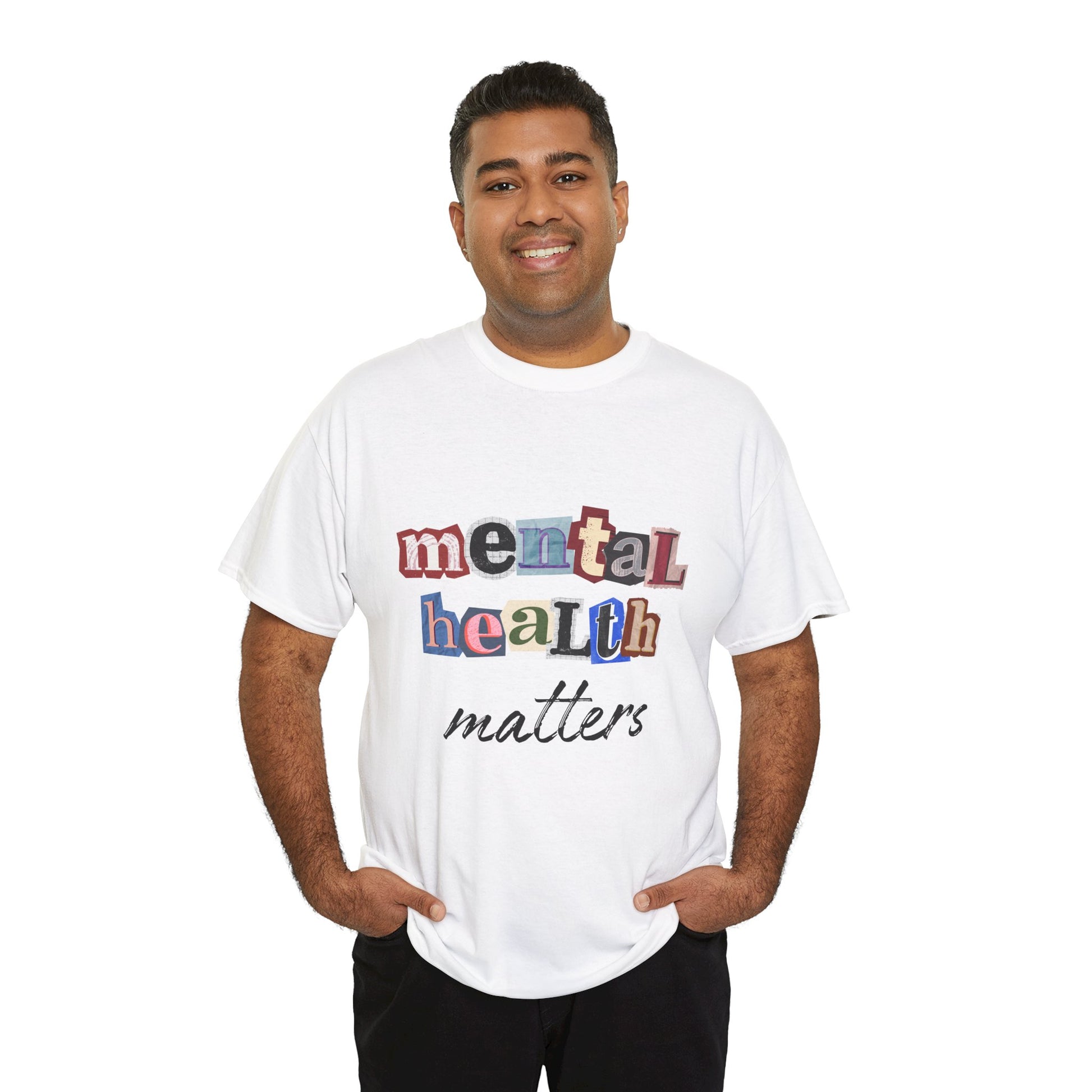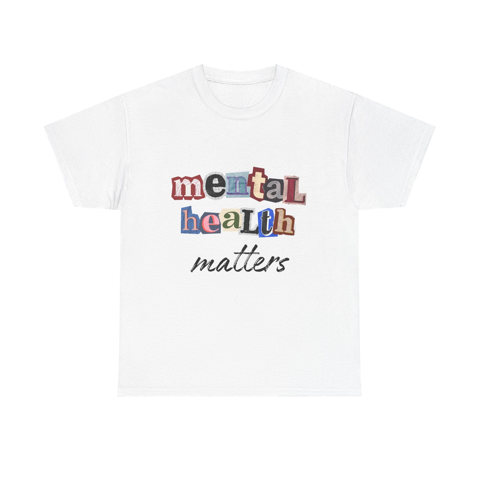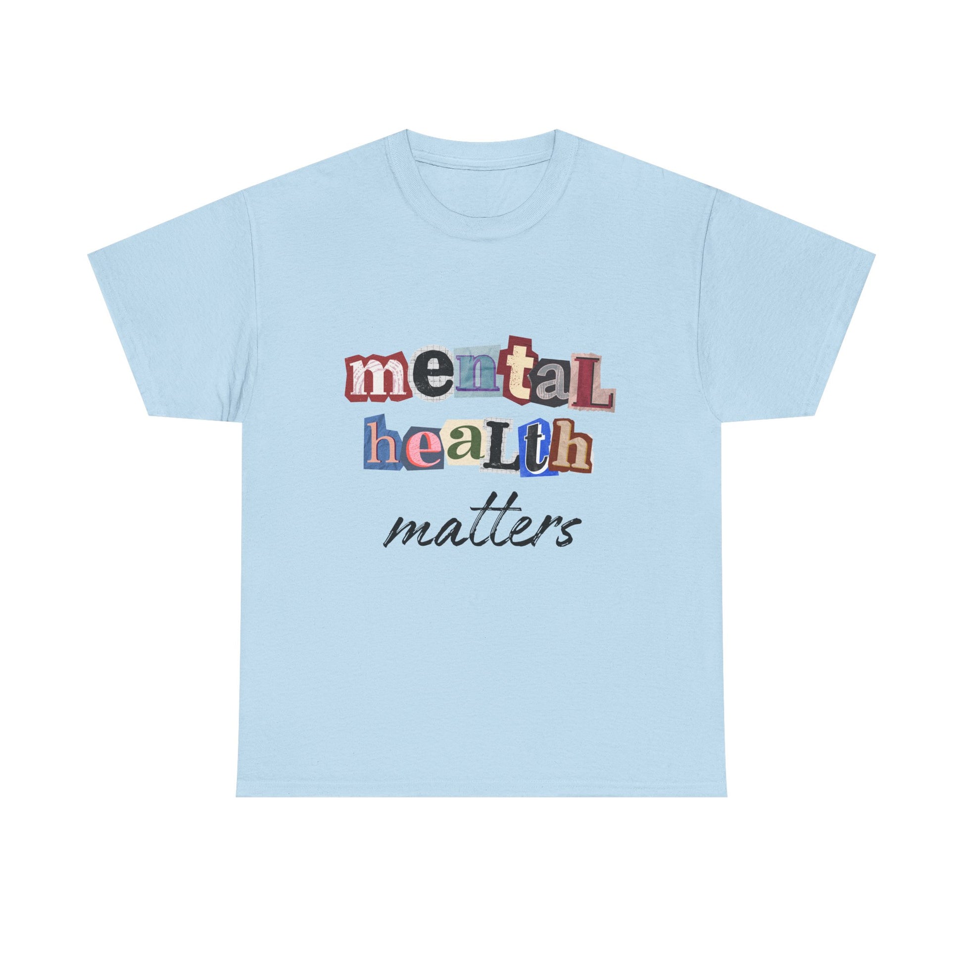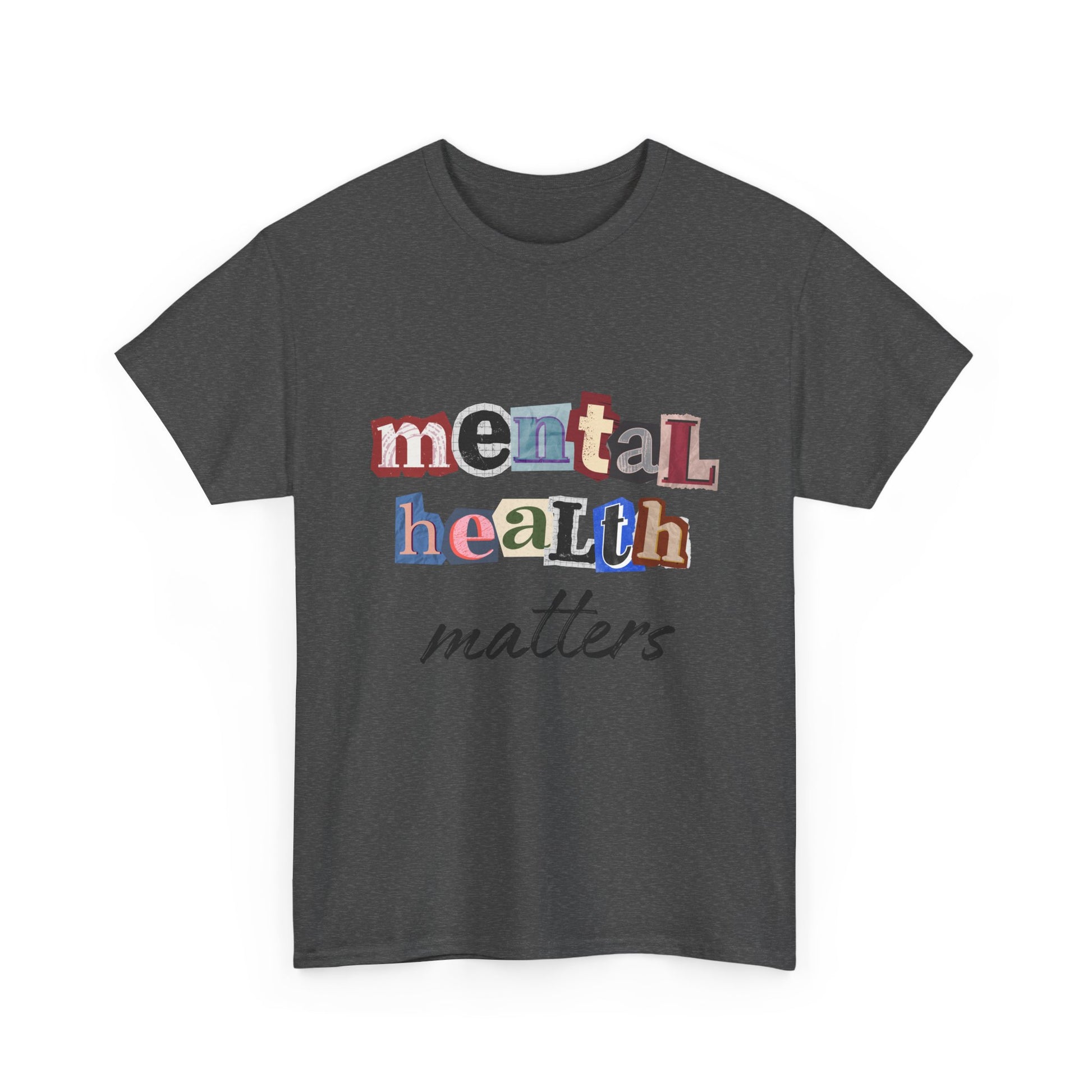 This soft, classic tee carries a quiet, sincere message: mental health matters. The design uses playful, mixed-letter typography on the chest with a gentle script beneath — a visual that feels like a handwritten reminder from a friend. Wear it on slow mornings, community walks, or at support-group meetups to start gentle conversations and show steady, compassionate solidarity. The shirt’s relaxed crewneck and sturdy medium-weight cotton hold the print clearly while staying comfortable through everyday wear.