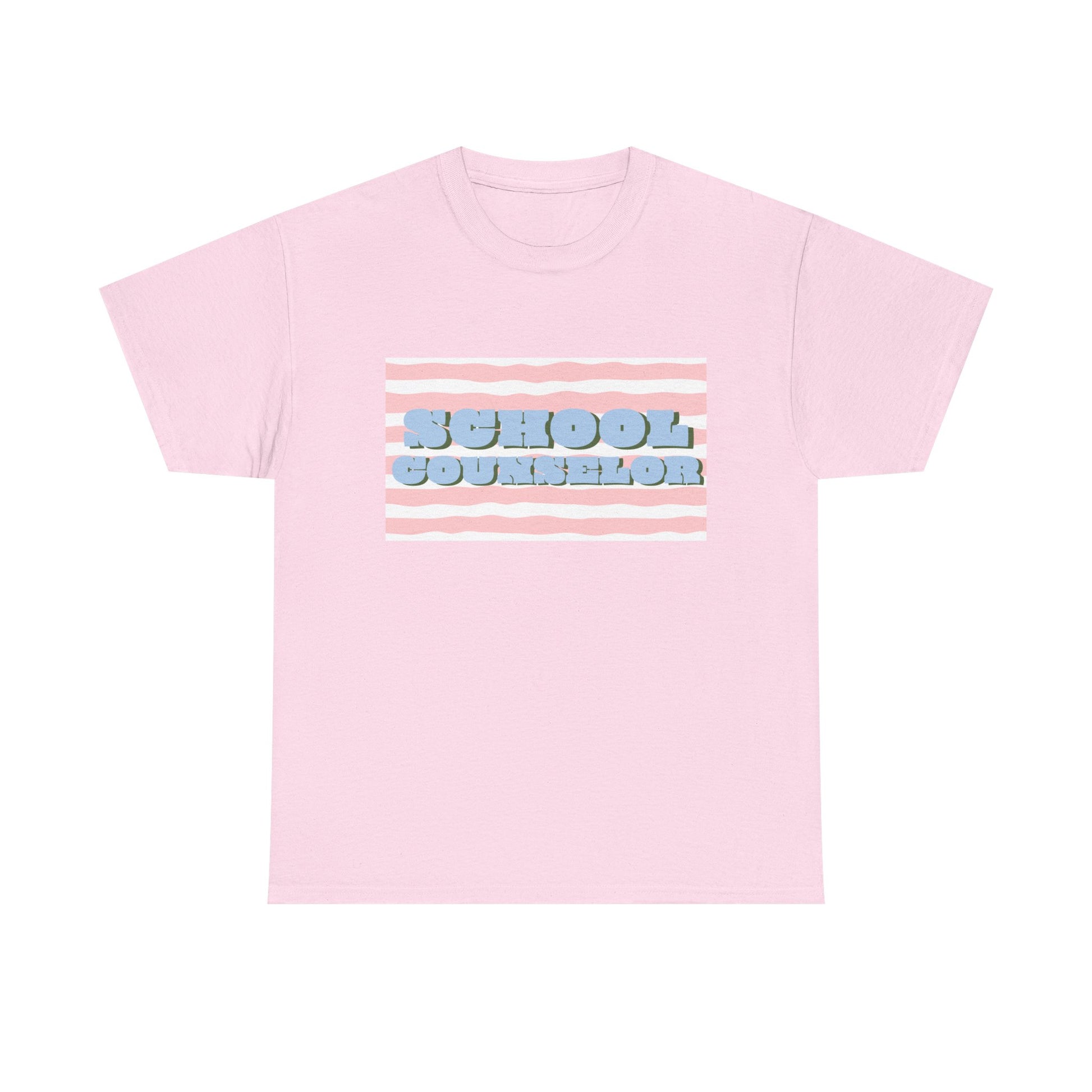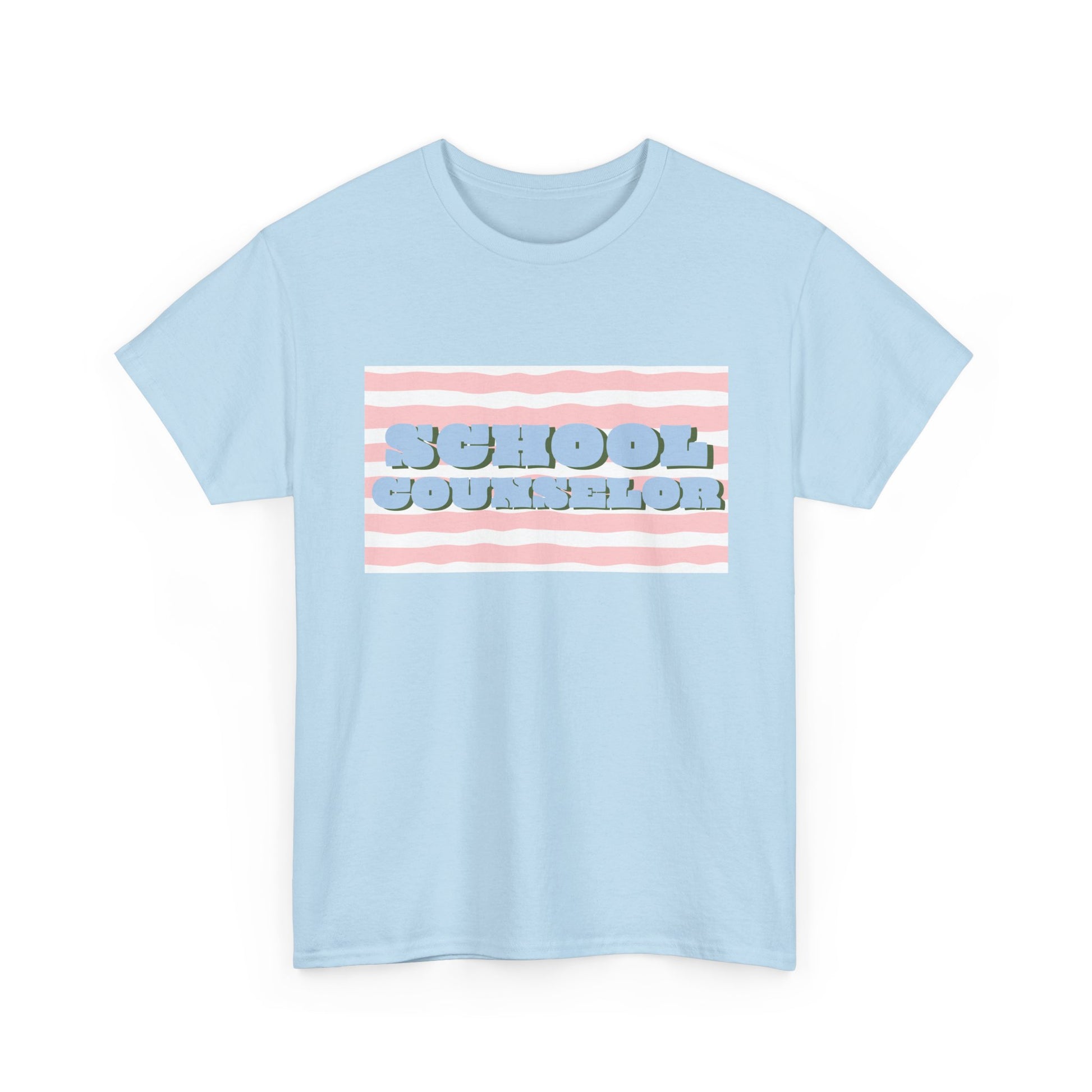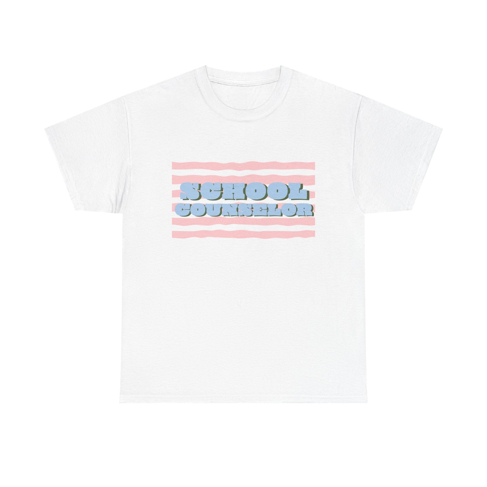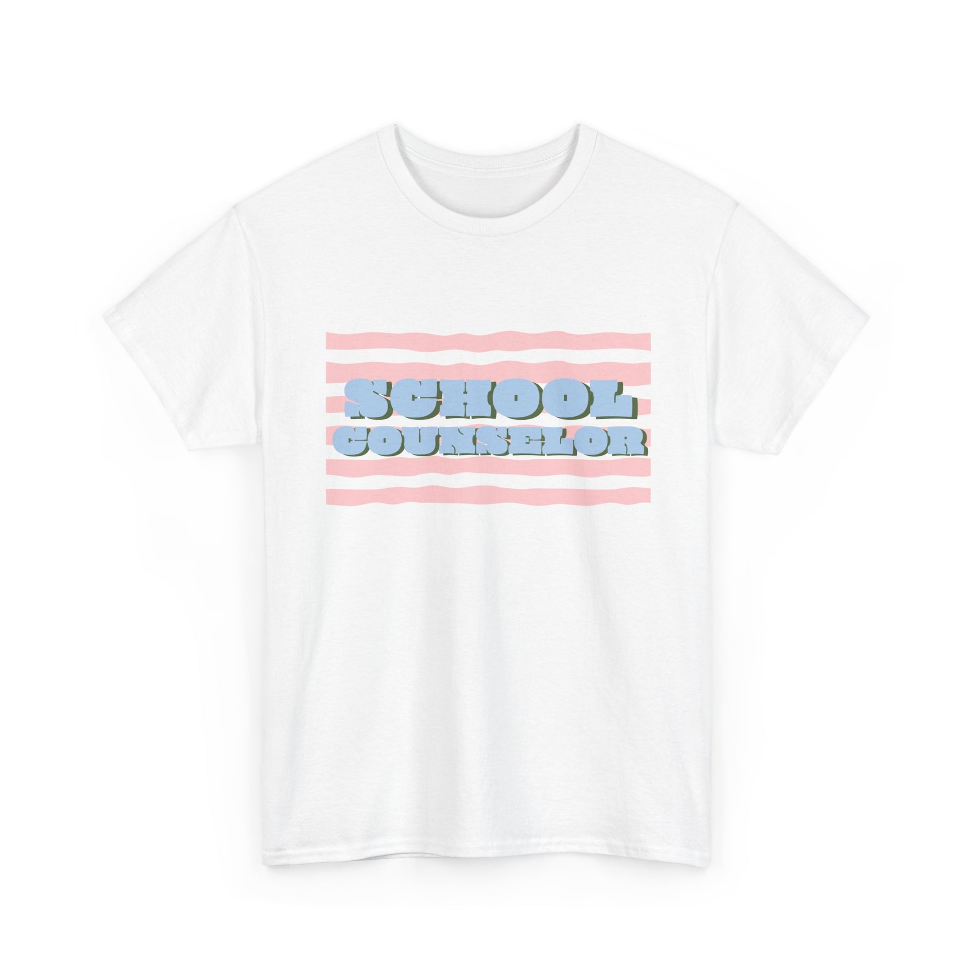 Soft, casual, and quietly confident — this classic tee carries a playful, retro-striped design that reads “SCHOOL COUNSELOR” in pillowy, raised lettering. The pastel pink and baby-blue palette feels calm and approachable, the kind of shirt that starts conversations in hallways and staff rooms alike. Wear it on busy mornings during drop-off, at parent-teacher nights, or on lighter-duty days when you want to nod to your role without saying a word. The relaxed crew neck and roomy silhouette layer easily under a cardigan or over a button-down. It’s made to move with you between classrooms, meetings, and quick recess yard check-ins, while the durable print keeps its soft, dimensional look through many washes.