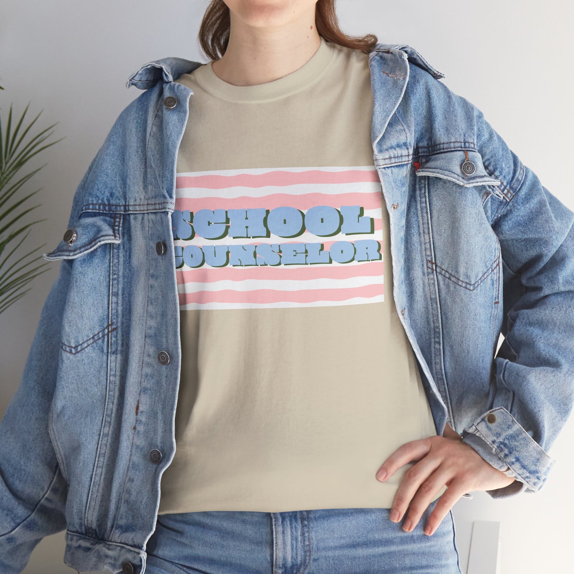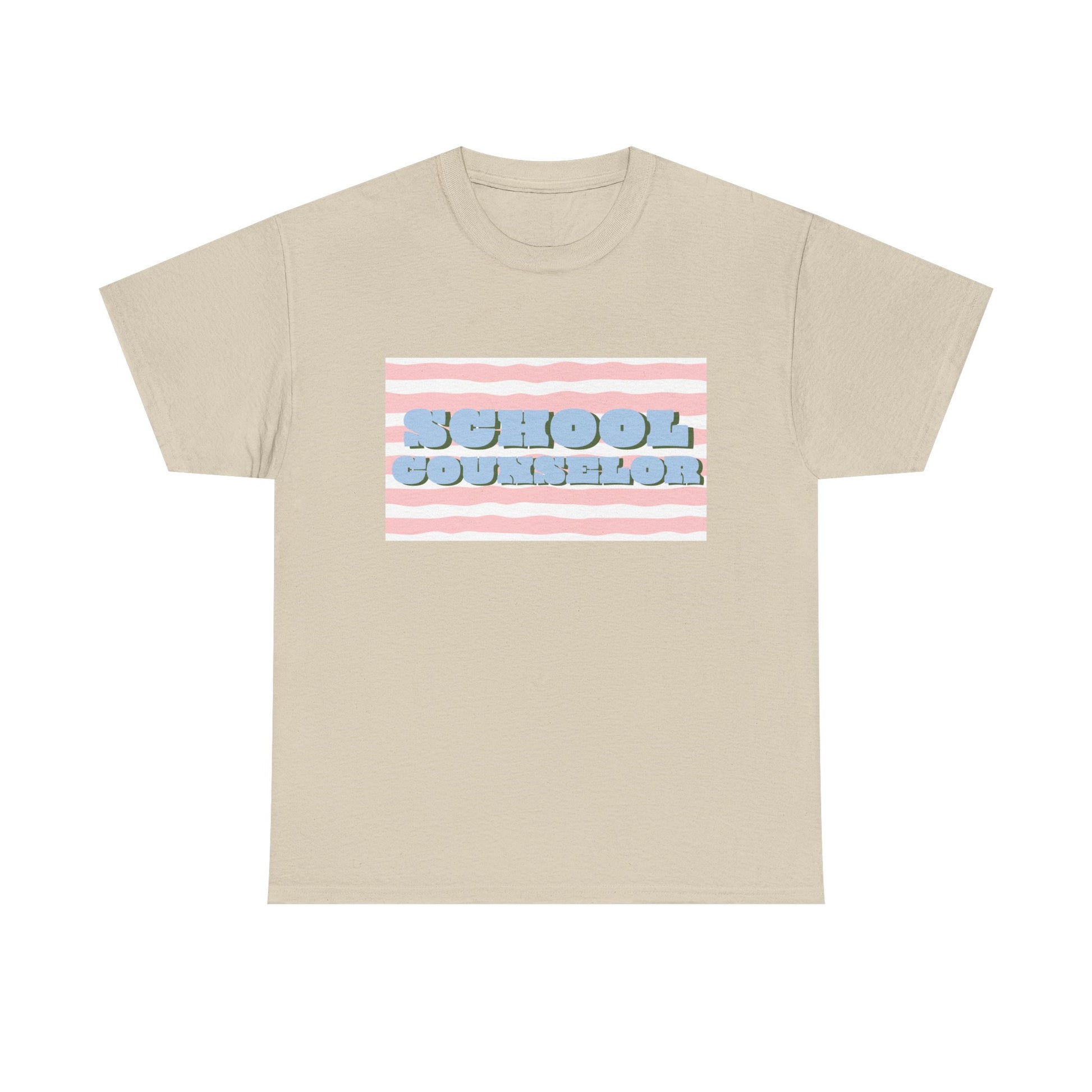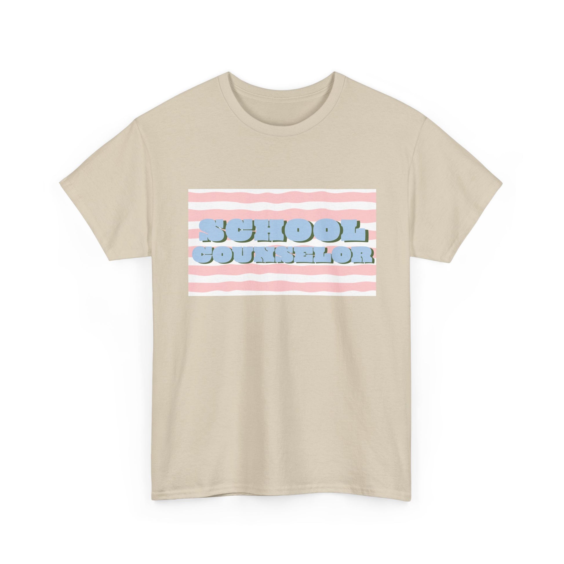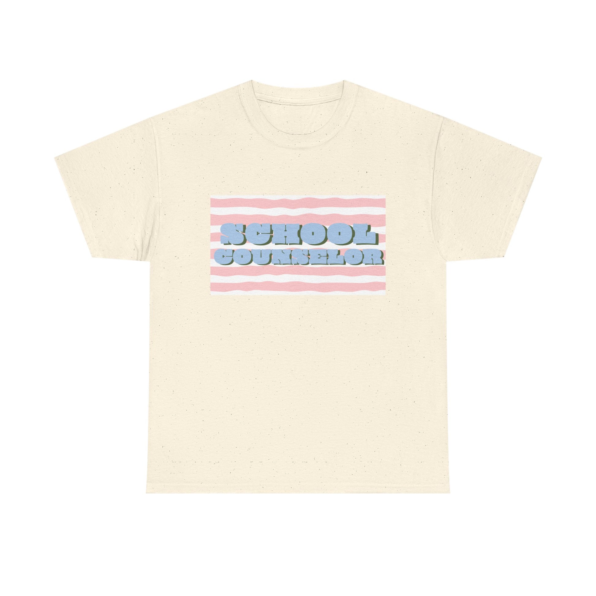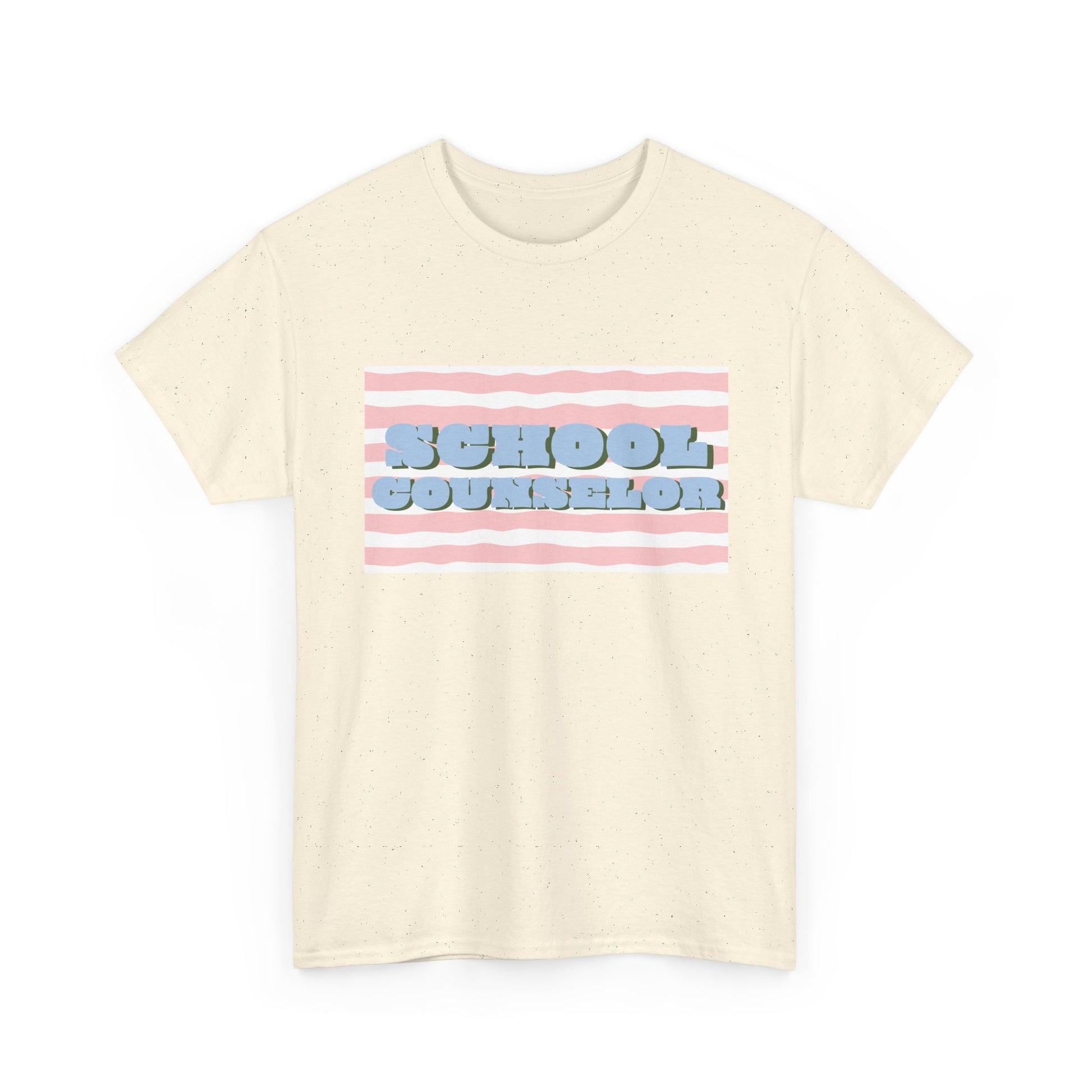 Soft, casual, and quietly confident — this classic tee carries a playful, retro-striped design that reads “SCHOOL COUNSELOR” in pillowy, raised lettering. The pastel pink and baby-blue palette feels calm and approachable, the kind of shirt that starts conversations in hallways and staff rooms alike. Wear it on busy mornings during drop-off, at parent-teacher nights, or on lighter-duty days when you want to nod to your role without saying a word. The relaxed crew neck and roomy silhouette layer easily under a cardigan or over a button-down. It’s made to move with you between classrooms, meetings, and quick recess yard check-ins, while the durable print keeps its soft, dimensional look through many washes.