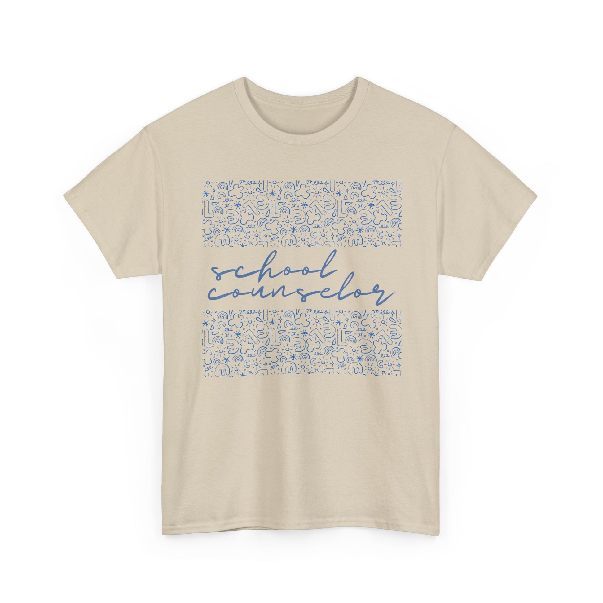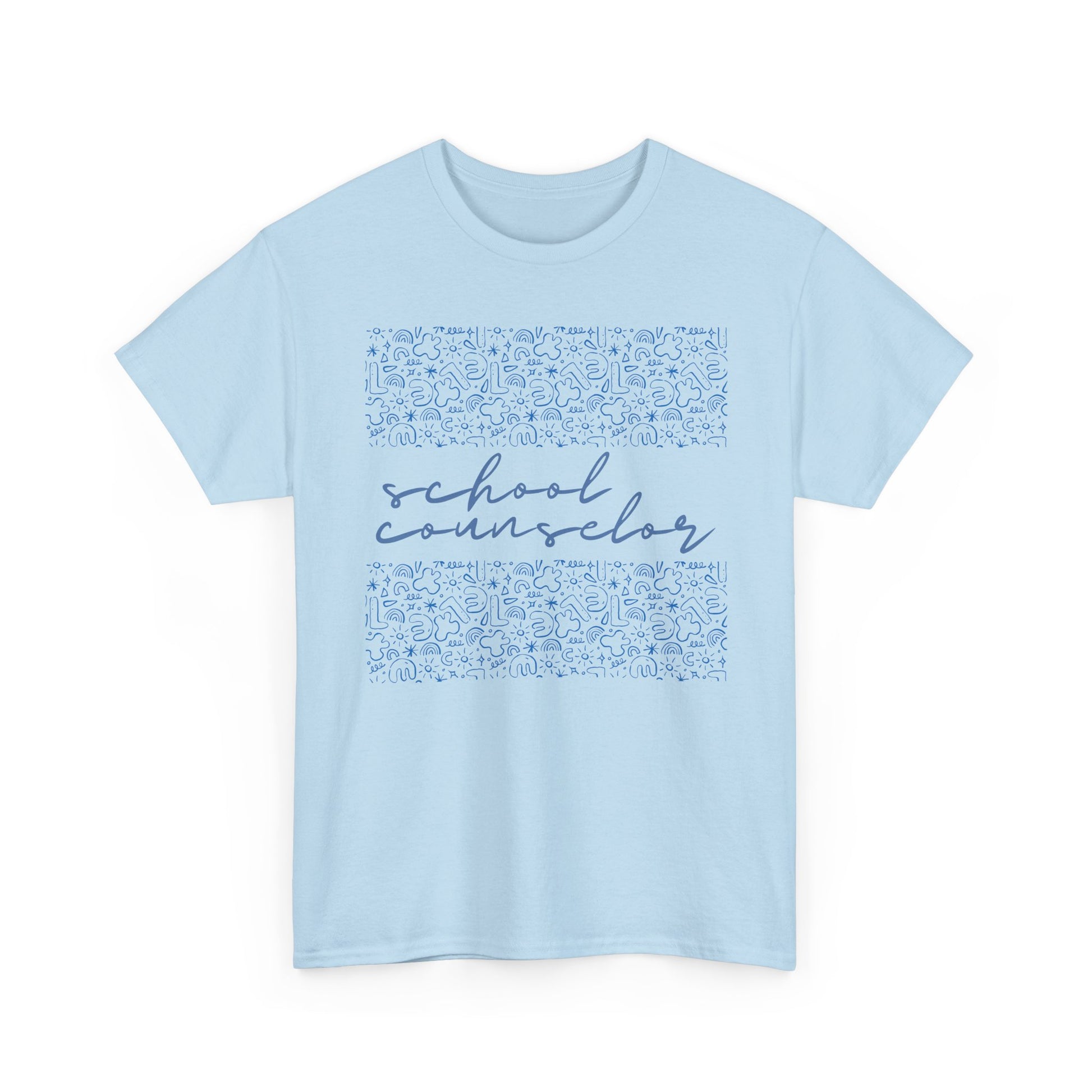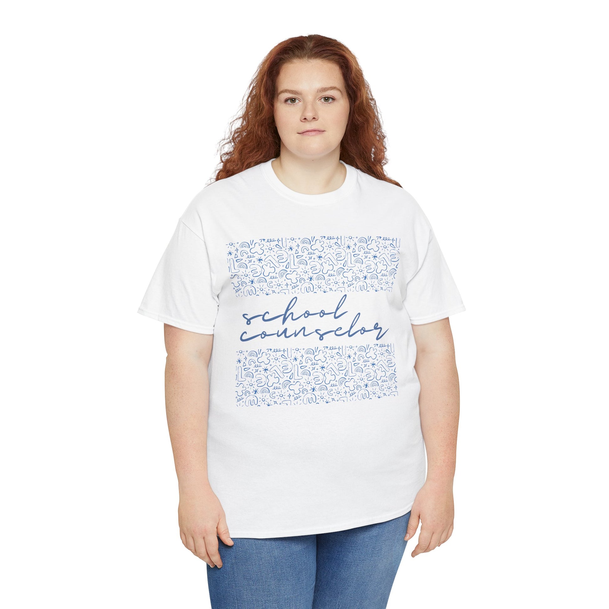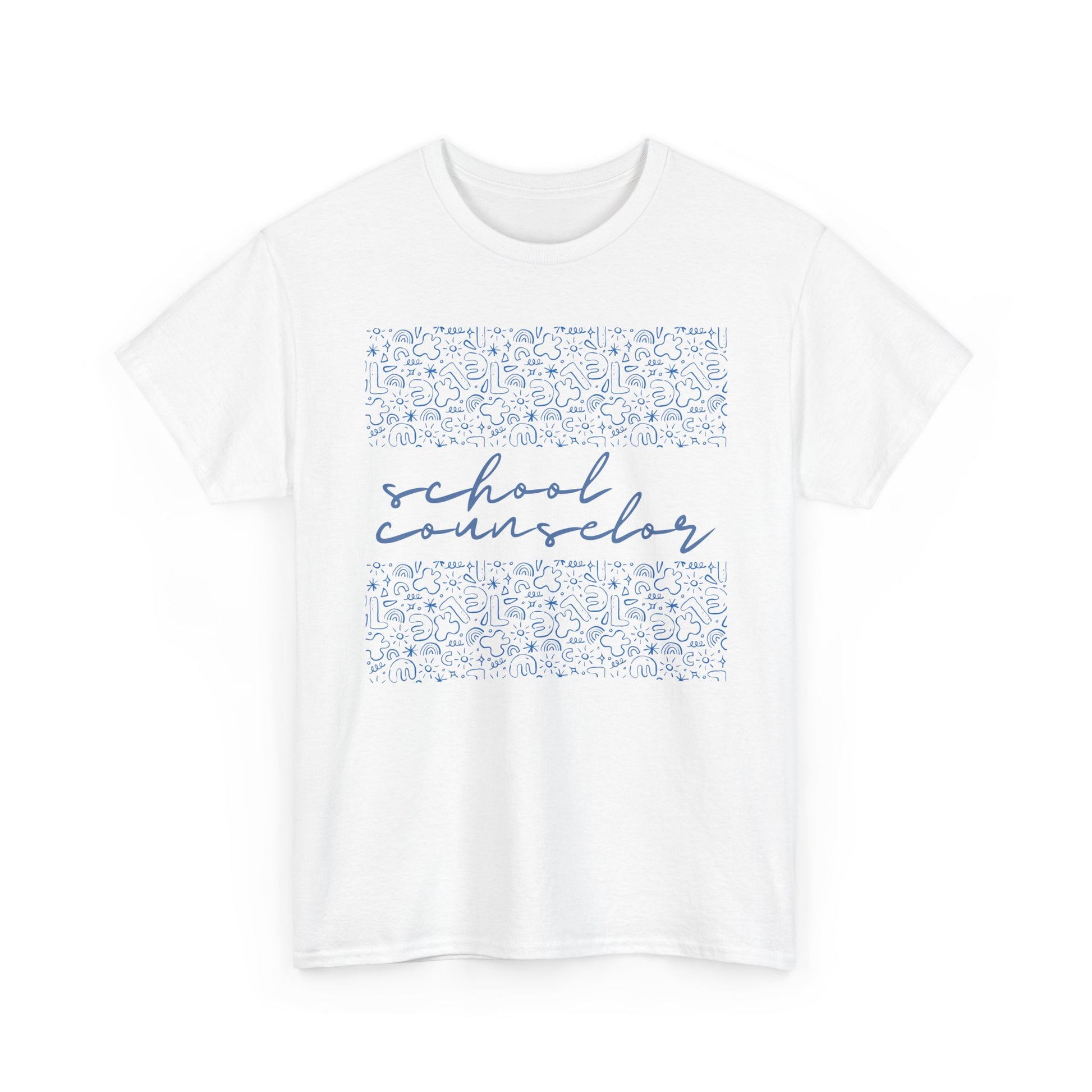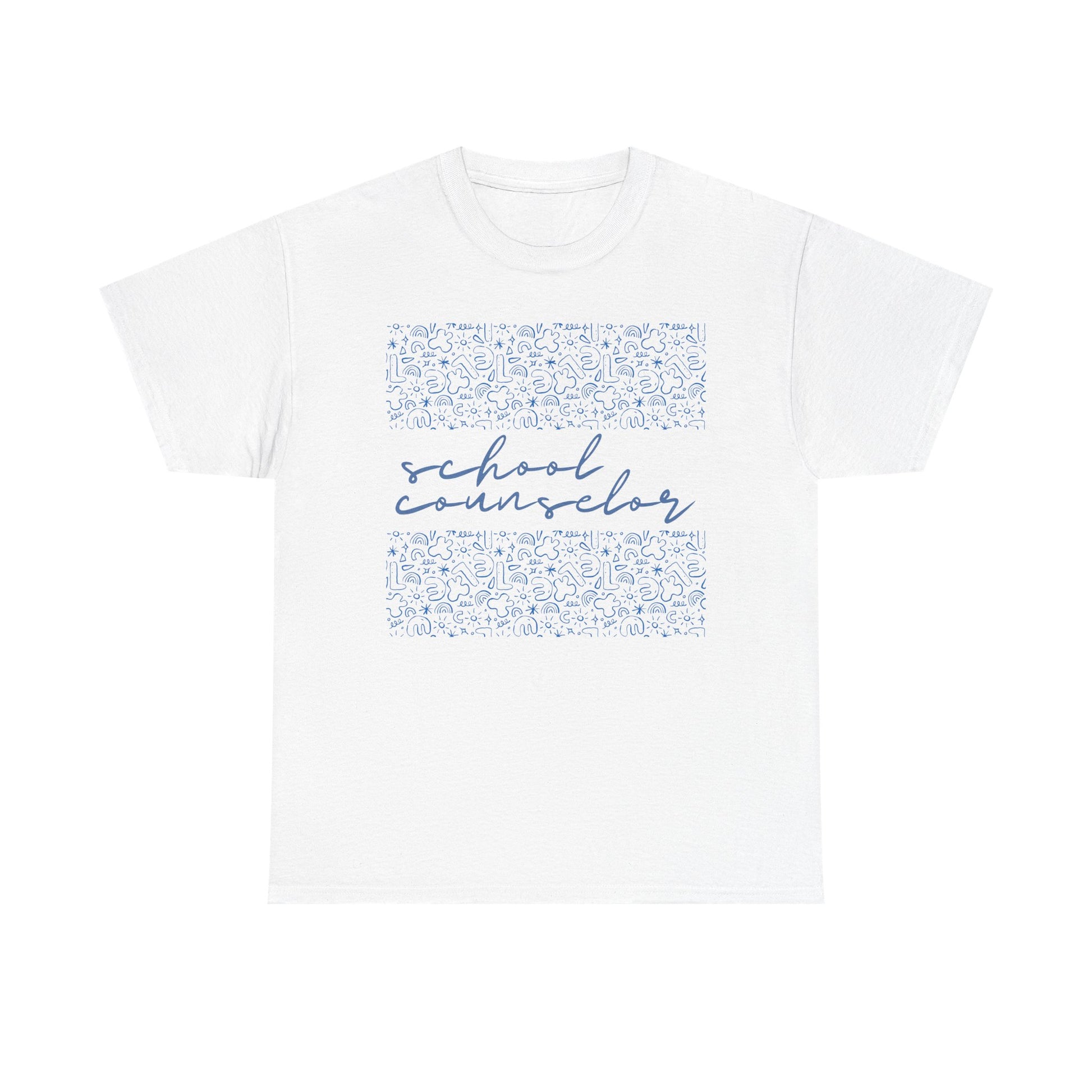 Lightweight, comfortable tee designed for school counselors who want a quiet, polished look during busy days. The soft white cotton lays flat and steady, letting the delicate blue lettering and small icon pattern stand out without shouting. Wear it between meetings, parent nights, and classroom visits — it reads calm, professional, and approachable. The classic crew neck and relaxed fit let you move freely while keeping a neat silhouette under cardigans or blazers. Subtle details and breathable fabric make this tee feel like the reliable piece you reach for when you want to look put-together and feel grounded.