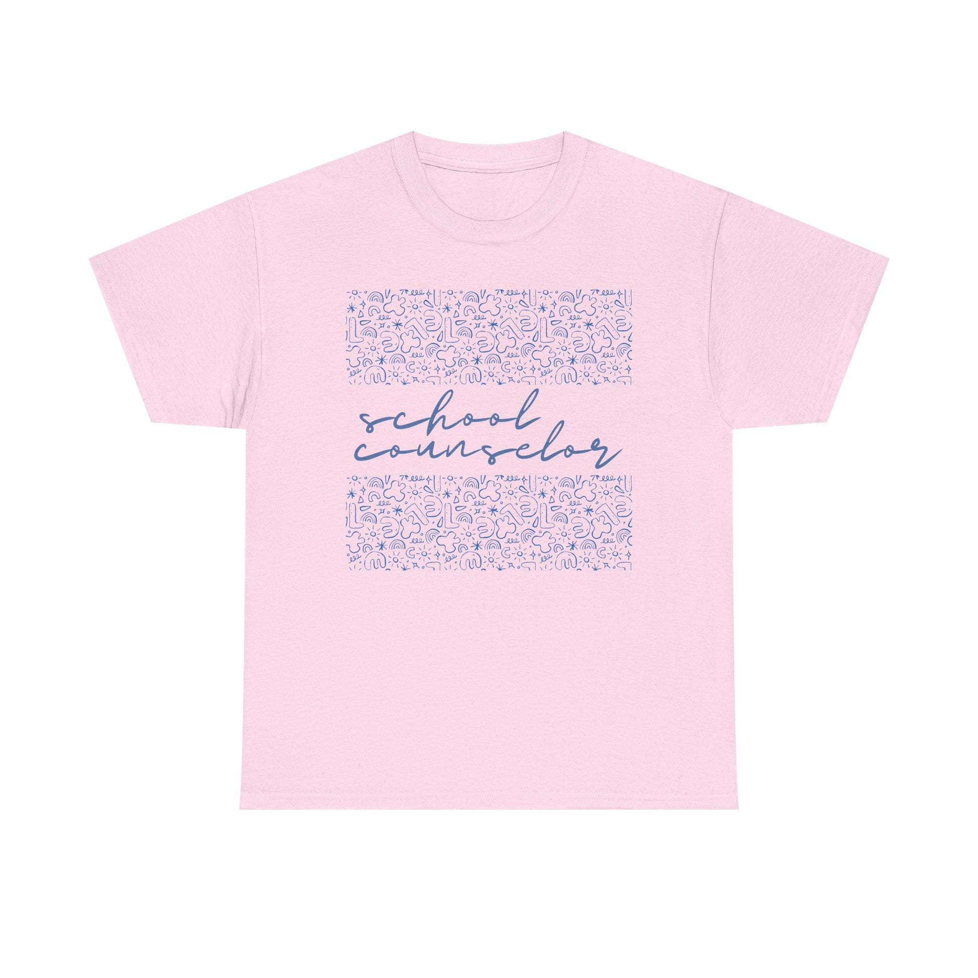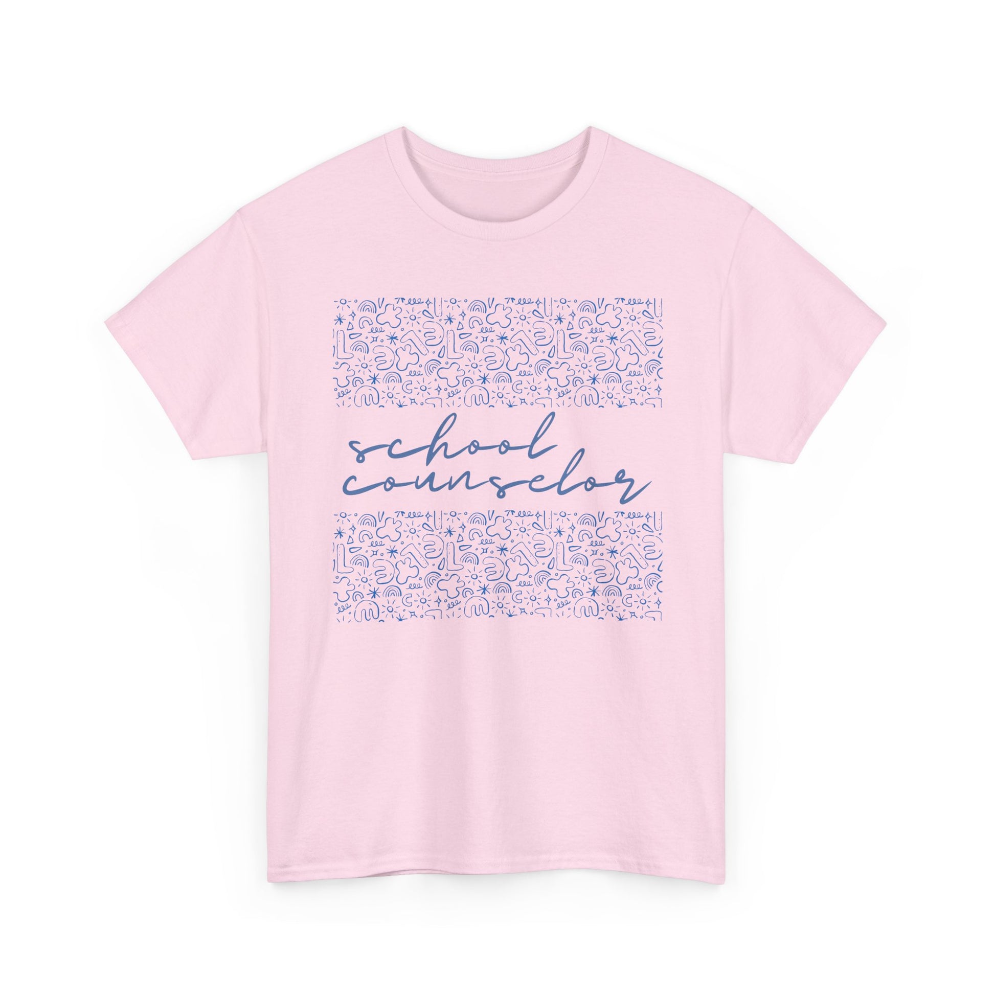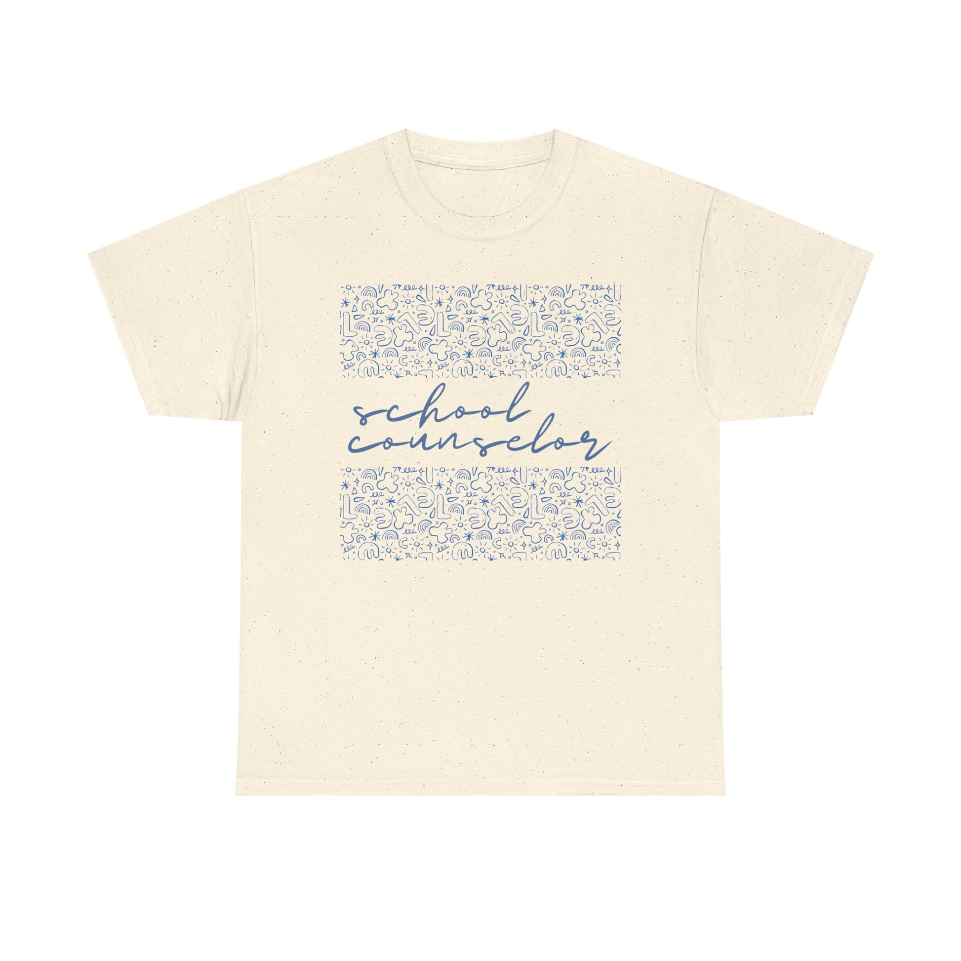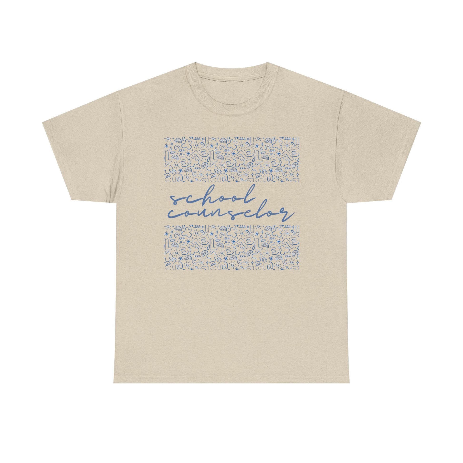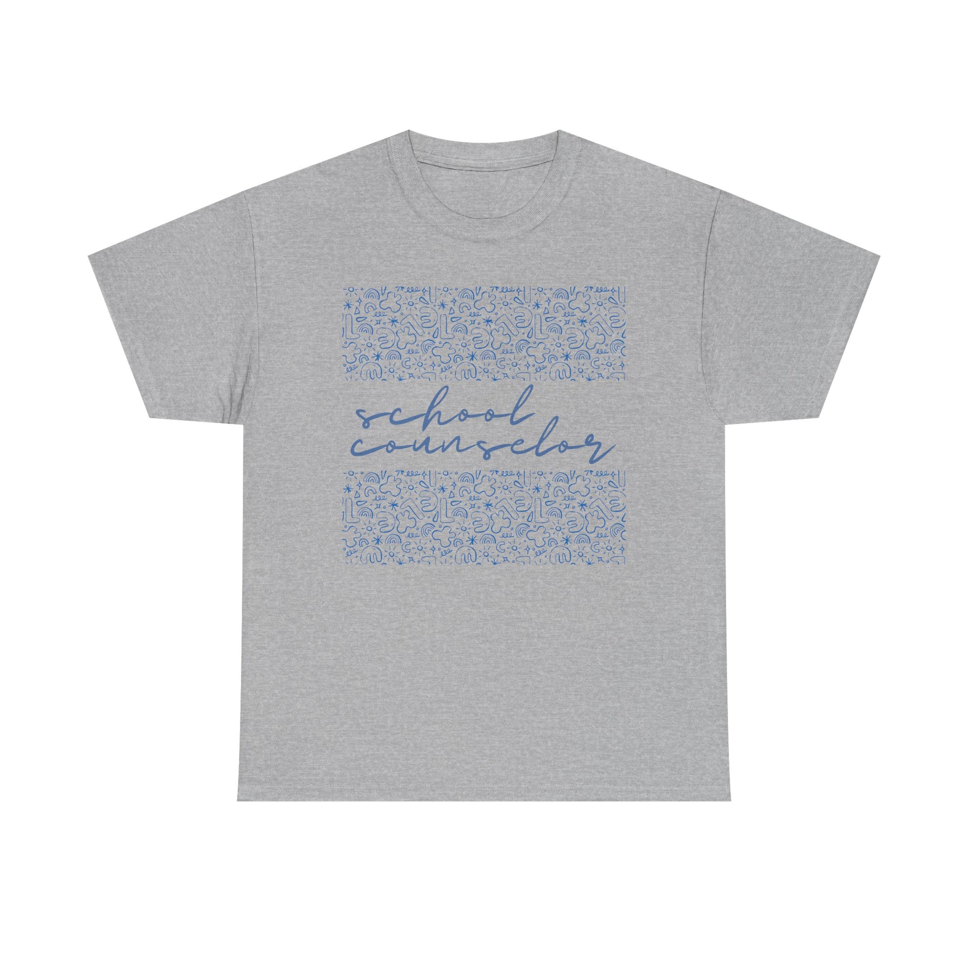 Lightweight, comfortable tee designed for school counselors who want a quiet, polished look during busy days. The soft white cotton lays flat and steady, letting the delicate blue lettering and small icon pattern stand out without shouting. Wear it between meetings, parent nights, and classroom visits — it reads calm, professional, and approachable. The classic crew neck and relaxed fit let you move freely while keeping a neat silhouette under cardigans or blazers. Subtle details and breathable fabric make this tee feel like the reliable piece you reach for when you want to look put-together and feel grounded.
